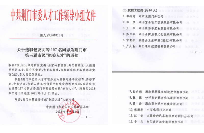 荊門通航兩名員工成功入選 荊門市“把關(guān)人才”